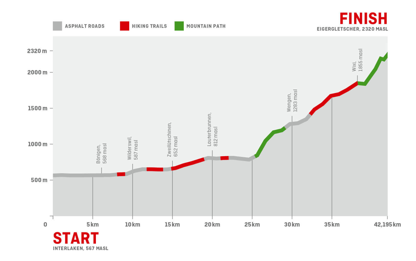 Wat deze marathon extra bijzonder maakt, is de sfeer onderweg. Traditionele muziek, vlaggenzwaaiers en enthousiaste supporters geven energie op de momenten dat het klimmen zwaar wordt. De finish op de Eigergletsjer, op 2.320 meter hoogte aan de voet van de imposante Eiger-noordwand, voelt als een beloning: niet alleen omdat je het gehaald hebt, maar omdat je deel hebt mogen uitmaken van zo veel pure natuur.